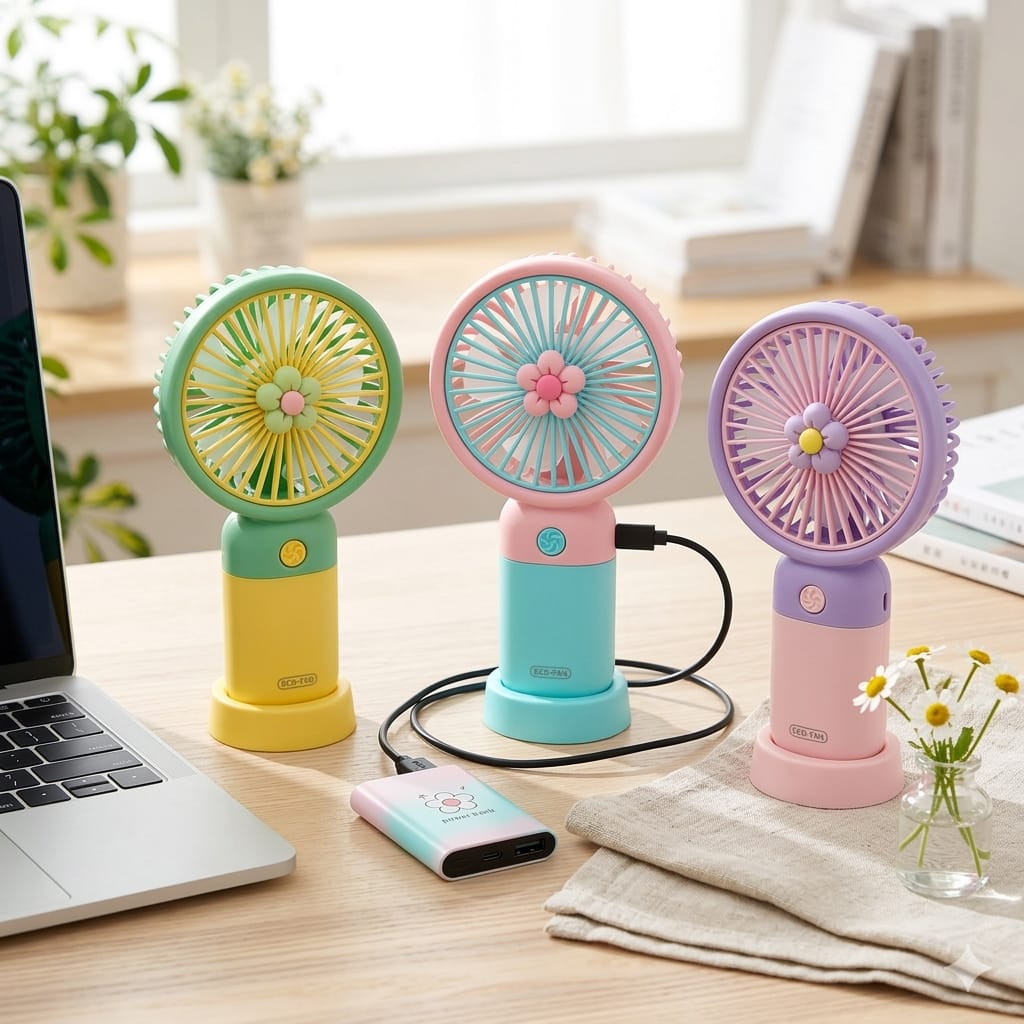 Mini Portable Rechargeable Handheld Personal Small Desk Fan with Base Cute Design Fan For Travel/Office/Desktop Kids Girls indoor Outdoor use (colors may be change)